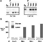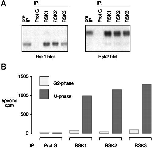 Immunoprecipitation of Rsk1 and Rsk2 by various RSK antisera. A, RSK1, RSK2, and RSK3 sera bring down similar amounts of Rsk1 and Rsk2. Lysates from G2 phase Xenopus oocytes were subjected to immunoprecipitation using RSK1, RSK2, or RSK3 antiserum, or protein G beads alone. The immunoprecipitates were subjected to 10.5% SDS-PAGE, followed by immunoblot analysis, as indicated above. The 68-kDa prestained molecular mass marker was run until 1 cm from bottom of gel to enhance separation of Rsk1 from Rsk2. B, kinase activities of RSK immunoprecipitates. Lysates from G2- or M phase oocytes were subjected to immunoprecipitation using RSK1, RSK2, or RSK3 antiserum, or protein G beads alone. The immunoprecipitates were washed and subjected to S6 kinase assay with an S6 peptide substrate and [γ-32P]ATP. Results were quantified by Cerenkov counting.