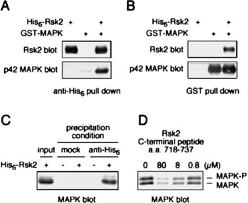 Complex formation between Rsk2 and p42 MAPK. A, p42 MAPK is pulled down with Rsk2. Lysates from Sf9 cells expressing either His6-Rsk2 or GST·MAPK were combined and incubated at 4 °C for 90 min with protein G-agarose beads and anti-His6 antibodies, both individually and together. His6-Rsk2 and any Rsk2-associated proteins were pulled down with anti-His6antibodies. The immunoprecipitates were then immunoblotted for Rsk2 and p42 MAPK. B, Rsk2 was pulled down with p42 MAPK. Lysates from Sf9 cells expressing His6-Rsk2 or GST·MAPK were combined with glutathione-agarose beads both individually and together and processed as in A. C, binding of endogenous Xenopus p42 MAPK to His6-Rsk2. G2 phase Xenopus oocyte lysates were incubated for 20 min at 4 °C in the presence or absence of purifiedXenopus His6-Rsk2 protein. These lysates were then incubated with protein G-agarose beads in the presence and absence of anti-His6 antibody and incubated for 90 min at 4 °C. The first lane represents the total lysate used in each immunoprecipitation. After centrifugation and washing, the beads were resuspended in sample buffer and resolved by 10.5% SDS-PAGE, followed by p42 MAPK immunoblotting. D, Xenopus egg extracts containing both phosphorylated and unphosphorylated MAPK were treated similarly to C except that lysates were preincubated in the presence or absence of a Rsk2 C-terminal peptide for 10 min at 22 °C prior to adding His6-Rsk2 protein. Beads were collected by centrifugation, washed, and processed as inC.