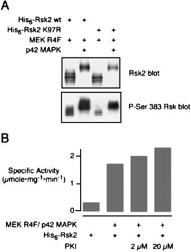 Activation of Rsk2 in vitro. A, hyperphosphorylation and Ser-383 phosphorylation of His6-Rsk2 in response to MEK R4F and p42 MAPK. Purified recombinant His6-Rsk2 (wild type or K97R mutant) was incubated with constitutively active MEK R4F with or without p42 MAPK, as indicated, for 60 min at 30 °C. The reaction products were subjected to SDS-PAGE followed by immunoblotting with RSK2 antibodies (top blot) or phospho-Rsk antibodies (bottom blot) that detected Rsk2 when it was phosphorylated at Ser-383. B, activation of His6-Rsk2 by MEK R4F and p42 MAPK. His6-Rsk2 was incubated as described inA and tested for S6 kinase activity as described in Fig.5.