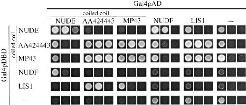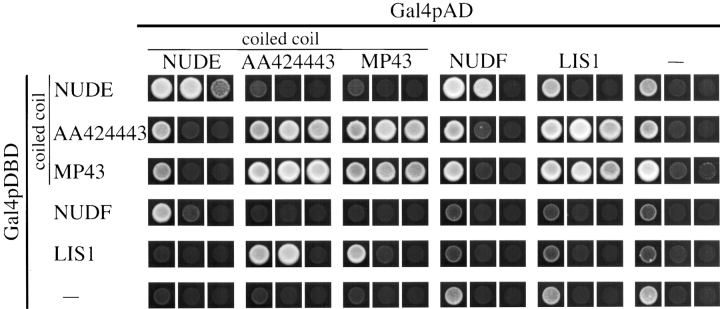 Figure 4. NUDE and NUDF proteins interact in a two-hybrid system. S. cerevisiae strain AH109 was transformed with pairwise combinations of plasmids expressing indicated proteins as fusions with either the Gal4p DNA binding (Gal4pDBD) or Gal4p activating (Gal4pAD) domains. NUDE, AA424443 and MP43 refer to the NH2-terminal domains of A. nidulans NUDE protein (residues 1–195) and corresponding fusions with human and X. laevis homologues, respectively (Fig. 3 B). For each pair of plasmids, growth on three media is shown (from left to right): SD/-Leu/-Trp/-His; SD/-Leu/-Trp/-His with 3 mM 3-AT; SD/-Leu/-Trp/-Ade. The first two media select for the expression of the HIS3 reporter gene, while the third medium selects for the expression of the ADE2 reporter gene. Growth in the absence of histidine or adenine is expected to result from interactions between proteins encoded by plasmids. Note that Gal4pDBD fusions with the coiled-coil domains activate the HIS3 gene expression in the absence of any interactions. 3 mM 3-AT (3-amino-1,2,4,-triazole), a competitive inhibitor of the HIS3 gene product, suppresses the resulting background growth.