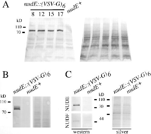 Figure 5. NUDE protein tagged with VSV-G epitopes coprecipitates with NUDF in A. nidulans protein extracts. (A) Total protein extracts from four independently isolated NUDE::(VSV-G)6 strains (#8, 12, 15, 17) and the parent strain with the wild-type nudE gene were analyzed by SDS-PAGE (4–20%) and immunoblotting with P5D4 antibody (left). Ponceau S staining of the membrane after protein transfer is shown on the right. (B) Same samples as in A (tagged strain #17 and untagged control) after better separation on a 10% SDS-PAGE. (C) The left panel shows immunoblotting of proteins precipitated by P5D4 antibodies coupled to Sepharose beads from nudE::(VSV-G)6 and nudE+ extracts with P5D4 and anti-NUDF antibodies. The right panel shows silver staining of the same samples.