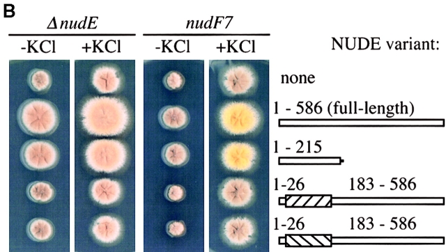 Figure 1. (A) Suppression of nud mutants by extra copies of the nudE and nudF6 genes. The indicated mutants (all are conditional, temperature sensitive) were transformed with either the empty vector pAid or pAid clones bearing nudE and nudF6 genes (plasmids recovered in the multicopy suppressor screen) and grown at 32°C. Transformants were gridded on YAG plates with or without KCl and incubated at 43°C or 32°C for 2 d. All strains have different color of conidia: yellow for nudF7, green (wild-type) for nudF6, chartreuse for nudA1, and white for nudC3. The intensity of the colony color is proportional to the number of conidia produced. Four independent transformants of the nudF7 mutant are shown for each plasmid to demonstrate reproducibility of phenotypes. (B) Complementation of the nudE deletion and the nudF7 mutant by extra copies of nudE, the nudE NH2-terminal domain, and nudE chimeras carrying coiled-coil regions from human and frog proteins, respectively. Strains were transformed with nudE variants in pAid vector and grown at 43°C. Numbers refer to amino acid residues of NUDE protein expressed by the constructs (see Fig. 3 for detailed amino acid sequences). Due to the presence of a fawn color marker, conidiating and unconidiating ΔnudE colonies have very similar colors at this temperature.