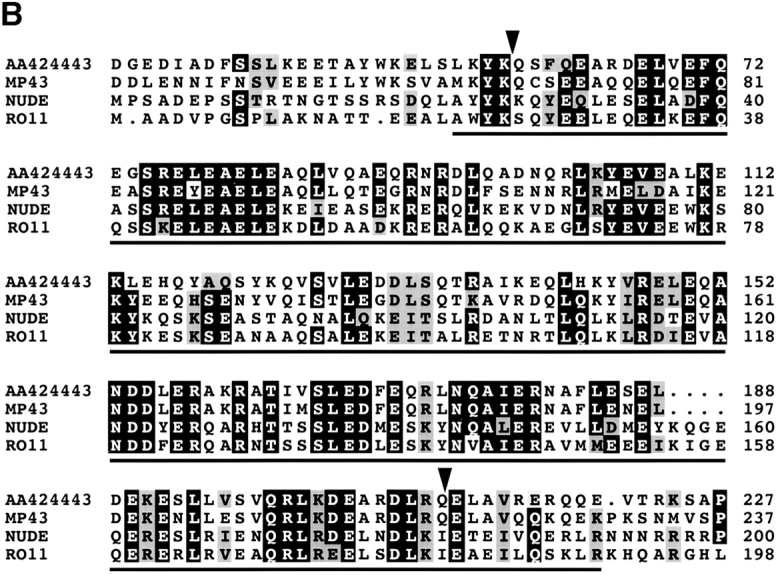 Figure 3. (A) Homology between A. nidulans NUDE protein and N. crassa RO11 protein. Shaded residues are predicted to form a coiled-coil structure. The probabilities of coiled-coil formation are 0.9–1 for the NH2-terminal region and 0.7–0.8 for the central region. Probabilities of coiled-coil formation were calculated using program COILS version 2.1 (MTIDK matrix, unweighted a and d positions, window = 28) at http://www.ch. embnet.org/software/COILS_form.html (Lupas et al. 1991). Assigning 2.5-fold weights to a and d positions slightly changes the probabilities at coiled-coil ends and increases probability for the central coiled-coil to 0.9–1. (B) Alignment between coiled-coil regions of an ORF predicted from human EST with GenBank accession number AA424443, X. laevis MP43 (accession number U95097), A. nidulans NUDE (accession number AF085679), and N. crassa RO11 (accession number AF015560). The underlined residues are predicted to form coiled-coil structure with probabilities >0.9. The regions between arrowheads were used in sequence exchange experiments to test if human or X. laevis coiled-coil regions can substitute for the NUDE coiled-coil. The percentages of identical (similar) residues for the underlined coiled-coil regions are 69% (82%) between NUDE and RO11, 38% (51%) between NUDE and AA424443, 39% (51%) between NUDE and MP43, 72% (83%) between AA424443 and MP43, 40% (52%) between RO11 and MP43, 40% (52%) between RO11 and AA424443.