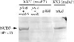 Figure 2. Extra copies of the nudE gene do not change the level of NUDF protein in the nudF7 mutant. Total protein extracts were prepared from nudF7 and nudA1 mutants carrying indicated plasmids and NUDF protein levels were analyzed by Western blotting with the anti-NUDF antibody. Strains were grown at 43°C in YG medium. A nudA1 mutant was included as a control of the wild-type level of NUDF. The amount of NUDF protein in the nudF6 mutant is less than in nudF7 (Xiang et al. 1995a).