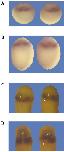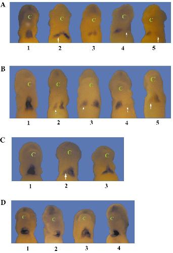 DNAs encoding tBMPRs, note abnormal fusion and reduced or absent staining on one side of the embryo. Later stage embryos (C and D)