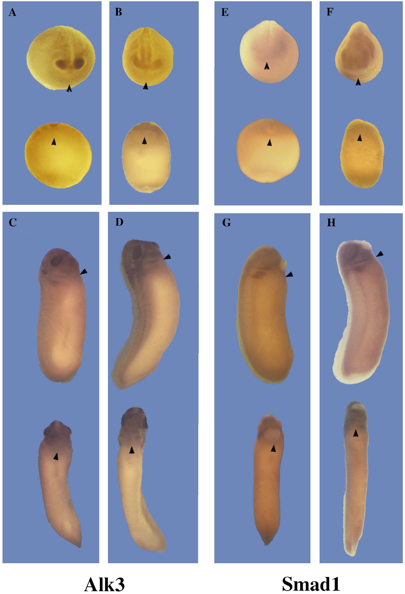 FIG. 5. Whole-mount in situ analysis of ALK3 and Smad 1 mRNA expression during Xenopus development. To examine expression of