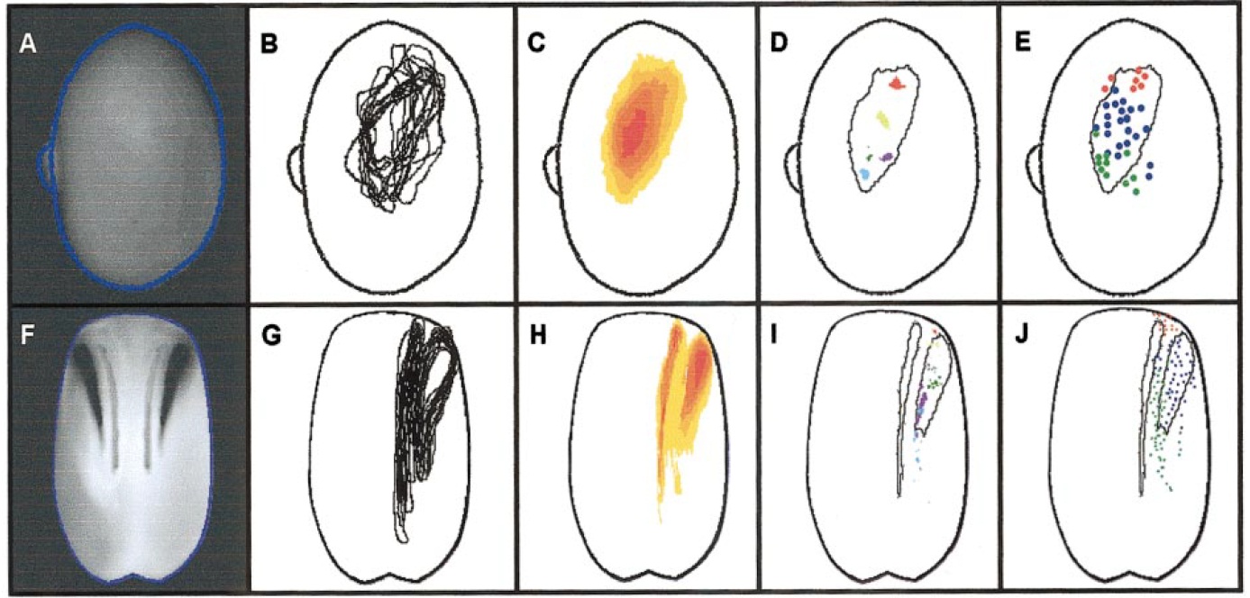 embryos were outlined (stage 11.5, B, or 16, G) and superimposed to generate a map showing the variation in the area of expression within