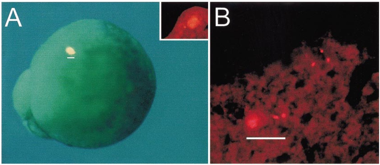stage 11.5; bar represents 100 mm. Inset shows a section through a similar embryo demonstrating a single domain of DiI labeling. (B) A thin