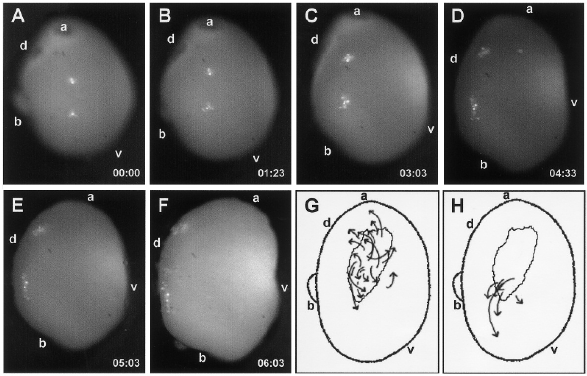 FIG. 5. Time-lapse videomicroscopy of DiI-labeled embryos. Two DiI injections were made in the dorsal and ventral regions of the Xsnail