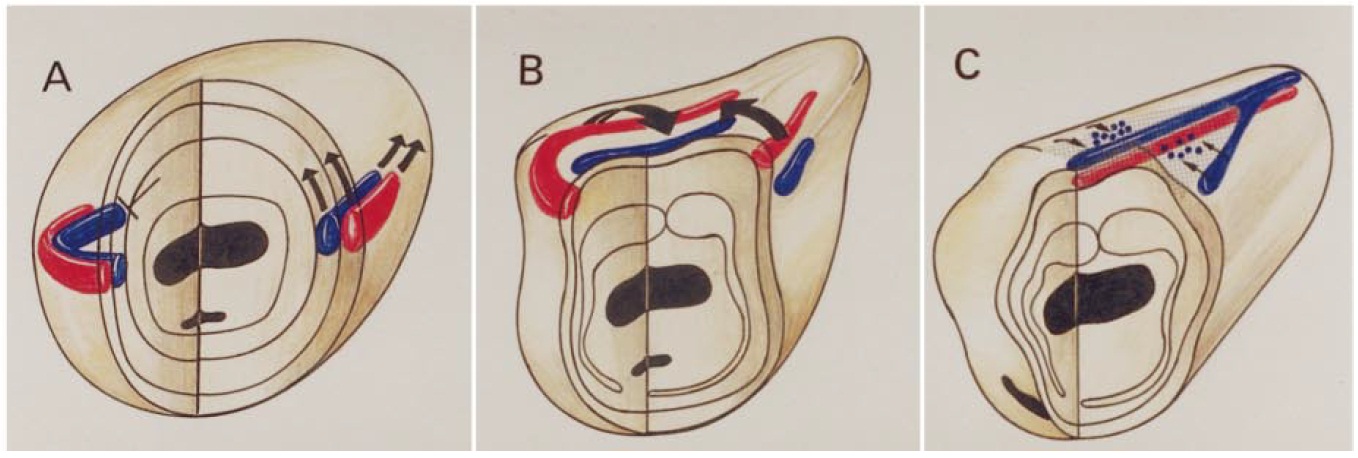 and superficial (red) layers of the ectoderm. Both layers move to the midline, but the superficial moves faster than the deep layer (arrows).