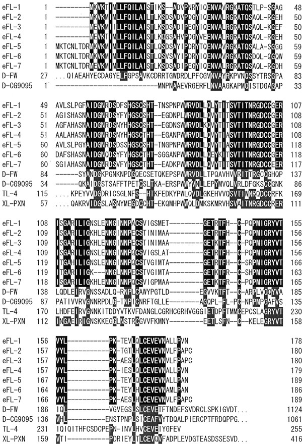 Lectins, a group of proteins that bind to cell surface carbohydrates and play important roles in innate immunity, are widely used experimentally to distinguish cell types and to induce cell proliferation. Eel serum lectins have been useful as anti-H hemagglutinins and also in lectin histochemistry as fucose-binding lectins (fucolectins), but their structures have not been determined. Here we report the primary structures and the sites of synthesis of eel fucolectins. Eel serum fucolectins were separated by two-dimensional gel electrophoresis and sequenced. cDNA cloning, based on the amino acid sequence information, and Northern blot analysis indicated that 1) the fucose-binding lectins are secretory proteins and have unique structures among the lectins, exhibiting only weak similarities to frog pentraxin, horseshoe crab tachylectin-4, and fly fw protein; 2) there are at least seven closely related members; and 3) their messages are abundantly expressed in the liver and in significant levels in the gill and intestine. The lectin-producing hepatic cells were identified by immunostaining; in the gill, exocrine mucous cells were stained, suggesting that serum fucolectins derive from the liver. Using primary culture of eel hepatocytes, the message levels were shown to be increased by lipopolysaccharide, suggesting a role for fucolectins in host defense. SDS-polyacrylamide gel electrophoresis analysis showed that eel fucolectins have a SDS-resistant tetrameric structure consisting of two disulfide-linked dimers.