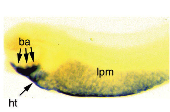 Fig. 4. eHAND expression in staged Xenopus embryos. eHAND expression in stage 15 Xenopus embryos was evident in the antero-lateralmesoderm (m) in lateral (A) and frontal (B) views. Bilaterally symmetric expression in the lateral plate mesoderm (lpm) was observed at stage 22 (C) and stage 33 in a ventral view (D). Expression in the precardiac mesoderm (pcm) became apparent at stage 30â33 (D). In a lateral view at stage 33 (E), branchial arch (ba) expression was observed in addition to the heart (ht) and lateral plate mesoderm expression. Magnification of the anterior region (F) better illustrated branchial arch and heart expression. High levels of heart expression were seen at stage 47 (G).