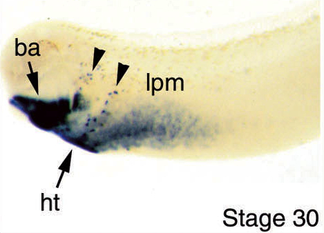 hand1 (heart and neural crest derivatives expressed 1 ) gene expression in Xenopus laevis embryo, assayed via in situ hybridization, NF stage 33, lateral view, anteriorleft, dorsal up.