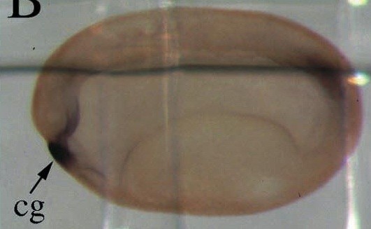 view shows expression at the posterior end of the notochord. (B,C) Stage 21; lateral (B) anterior front (C) views show strong staining in the cement gland