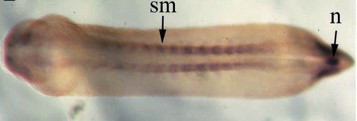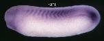 anlage. (D) Stage 25; lateral view, staining in the somites. (E) Stage 27. (E) Lateral view, staining in somites and in the tail bud. (F) Dorsal view of a cleared