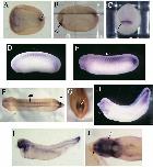 Fig. 1. The developmental expression of TGF-b5 in Xenopus laevis. Anterior is to the left except in C, G. Cleared embryos (A,B,F,G,I,J). (A) Stage 14; a dorsal