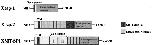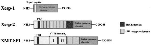 Predicted domain structure of Xesp-1, Xesp-2 and XMT-SP1. Xesp-1 has a signal peptide and a serine protease domain. Xesp-2 has a transmembrane (TM) binding domain, eight LDLR domains, a SRCR domain, and a serine protease domain. XMT-SP1 has a transmembrane (TM) binding domain, two CUB domains, four LDLR domains, and a serine protease domain.