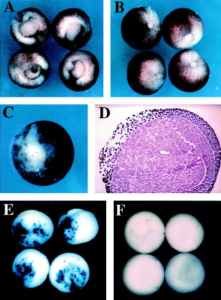Effect of ectopic expression of Xesp-2 and XMT-SP1. The wild-type (A) or mutant (B) mRNA encoding Xesp-2 was injected into both blastomeres at the two-cell stage. Overexpression of the wild-type Xesp-2 disturbed the closure of blastopore, but there was no defect after injection of the mutant form. Unilateral injection of wild-type XMT-SP1 at the two-cell stage results in cell death in the injected side (C) where non-adherent cells are observed (D). TUNEL assay also shows apoptotic cell death in the side injected with wild-type XMT-SP1 (E), but no apoptotic signal after injection of the mutant form (F).