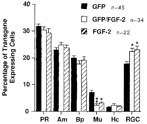 The developing vertebrate retina produces appropriate ratios of seven phenotypically and functionally distinct cell types. Retinal progenitors remain multipotent up until the last cell division, favoring the idea that extrinsic cues direct cell fate. We demonstrated previously that fibroblast growth factor (FGF) receptors are necessary for transduction of signals in the developing Xenopus retina that bias cell fate decisions (S. McFarlane et al., 1998, Development 125, 3967-3975). However, the precise identity of the signal remains unknown. To test whether an FGF signal is sufficient to influence cell fate choices in the developing retina, FGF-2 was overexpressed in Xenopus retinal precursors by injecting, at the embryonic 16-cell stage, a cDNA plasmid encoding FGF-2 into cells fated to form the retina. We found that FGF-2 overexpression in retinal precursors altered the relative numbers of transgene-expressing retinal ganglion cells (RGC) and Müller glia; RGCs were increased by 35% and Müller glia decreased by 50%. In contrast, the proportion of retinal precursors that became photoreceptors was unchanged. Within the photoreceptor population, however, we found a twofold increase in rod photoreceptors at the expense of cone photoreceptors. These data are consistent with an endogenous FGF signal influencing cell fate decisions in the developing vertebrate retina.