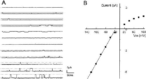 Figure 1. Single-channel conductance of Kir4.1–Kir5.1. (A) Single-channel current was recorded from an inside-out patch using symmetric concentrations of K+ (150 mM) on both sides of the patch membrane at various membrane potentials (Vm). An active channel is seen with a clear inward rectification at hyperpolarizing Vm. Solid line, opening; dotted line, closure. (B) Single-channel conductance calculated from the channel in A is linear at Vm = −40 to −120 mV. The straight line represents a slope conductance of 59 pS.
