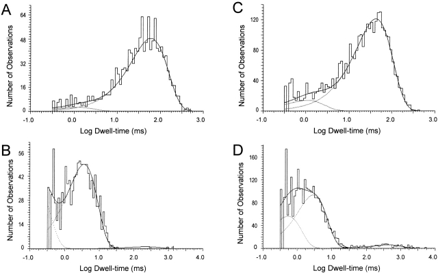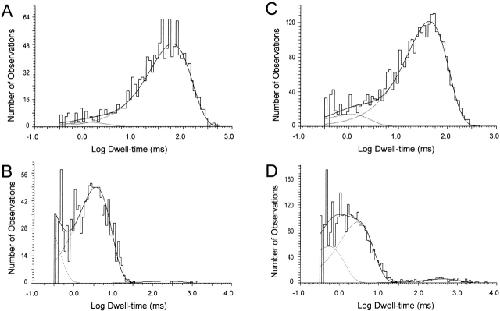 Figure 3. Dwell-time histograms of single channel Kir4.1–Kir5.1. (A and B) At pH 8.5, one active channel was recorded from an inside-out patch with equal concentrations of K+ on both sides of patch membrane and Vm of −80 mV. (A) Open dwell-time histogram of the Kir4.1–Kir5.1 current. Data fitting was done using four stretches of data collected from the same patch with an interval of 2 s and a total recording time of 80 s. The channel open dwell-time histogram can be fitted with two exponentials with time constants τO1 1.2 and τO2 59.9 ms. (B) Closed dwell-time histogram of this channel can also be fitted with three exponentials with time constants τC1 0.2, τC2 3.5, and τC3 224.6 ms. (C and D) Activity of the same channel (Popen) decreased by 50% at pH 7.5. (C) The open dwell-time histogram obtained from 10 stretches of data totaling 200 s is fitted using two exponentials with τO1 1.1 and τO2 41.2 ms. (D) Closed dwell-time histogram is expressed with three exponentials with τC1 0.8, τC2 3.2, and τC3 438.7 ms.