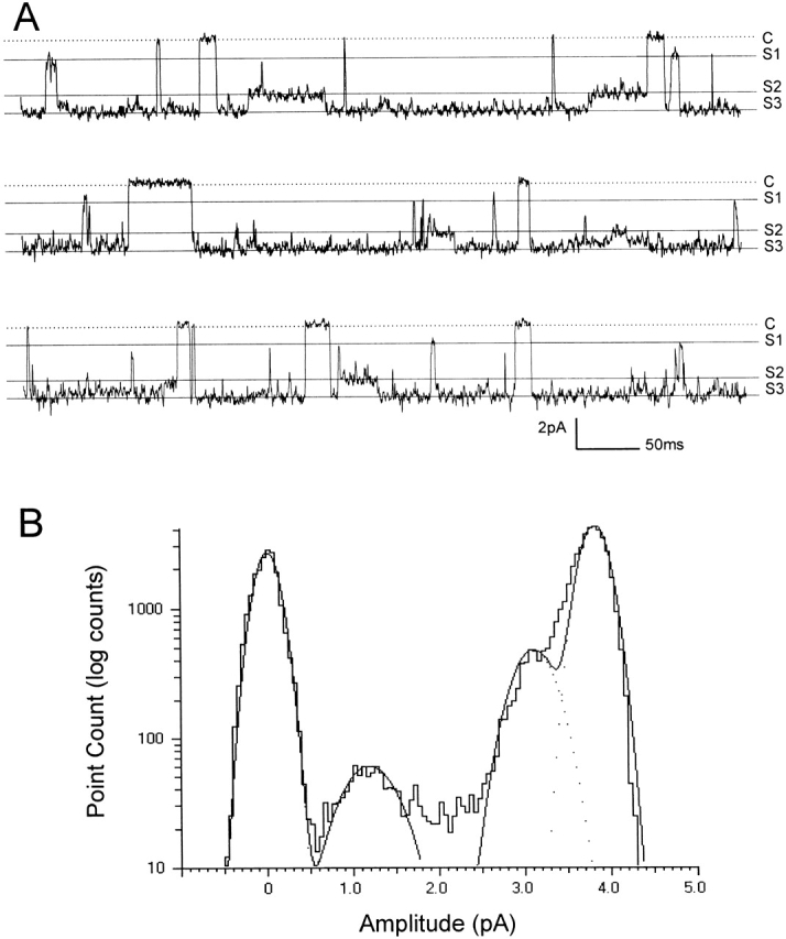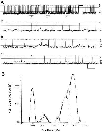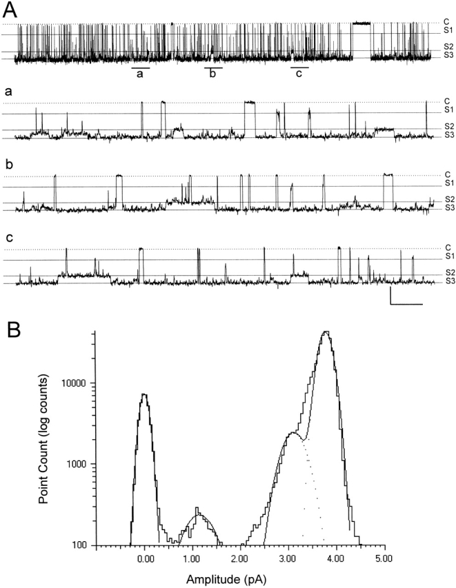 Figure 2. Single-channel activity of the Kir4.1–Kir5.1 current. (A) Single-channel activity was recorded from an inside-out patch with equal concentrations of K+ on both sides of the patch membrane. An active channel was seen at Vm = −60 mV. At pH 8.5, this channel showed a high channel activity with Popen 0.915. In its long-lasting openings, brief closures can be seen that are better illustrated in extended time scales (a–c). a, b, and c are obtained from positions a, b, and c in the top trace, respectively. Also in a–c, sublevels of conductance can bee seen. Calibration: 2 s for the top trace and 200 ms for a–c; 2 pA for all. C, closure; S1, the first level of substate conductance; S2 the second level of substate conductance; S3, full opening. (B) All-point histogram of the same Kir4.1–Kir5.1 current shows channel openings at 3.78 pA at a membrane potential of −60 mV. Two sublevels of conductance are found between the closures and full openings with their peaks at ∼1/4 and 3/4 of the amplitude of full openings. Data are obtained from A as a stretch recording of 20 s, displayed as a logarithmic scale in the y axis and fitted using the Gaussian distribution with each peak at 0.0, 1.14, 3.11, and 3.78 pA.