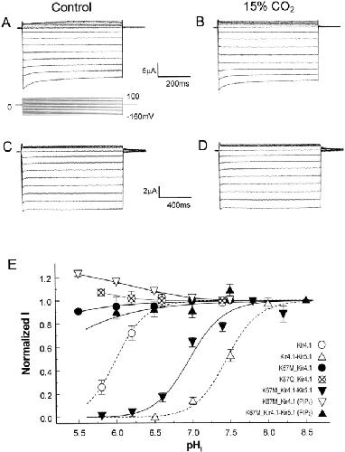 Figure 8. Effects of Lys67 mutation on CO2 sensitivity of Kir4.1 and Kir4.1–Kir5.1 currents. (A) Whole-cell currents were recorded from oocytes. Inward-rectifier K+ currents were seen in an oocyte that had received an injection of K67M mutant Kir4.1. (B) Although the K67M mutation did not affect the baseline currents, channel sensitivity to 15% CO2 (5 min) was abolished. (C) The K67M Kir4.1 was created on a tandem dimer of Kir4.1–Kir5.1, the Kir4.1–Kir5.1 currents were observed 3 d after the injection. (D) These Kir4.1–Kir5.1 currents lost their hypercapnic sensitivity, as no evident change in the current amplitude was seen after 7 min exposure to 15% CO2. (E) Titration curves of Lys67 mutations on Kir4.1 and on a tandem dimer of Kir4.1–Kir5.1. While the Lys67 mutations abolished pHi sensitivity of Kir4.1, the Kir4.1–Kir5.1 with this mutation remained pHi sensitive (pKa 6.95, h 2.2). In the presence of 10 μM PIP2, however, Kir4.1–Kir5.1 carrying the K67M mutation lost its pHi sensitivity.