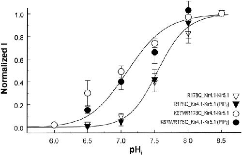 Figure 9. Mutation of Arg178 in Kir5.1 eliminated the effect of PIP2 on channel sensitivity to pHi. In the tandem dimer of Kir4.1âKir5.1, site-specific mutations were made at Lys67 in Kir4.1 and Arg178 in Kir5.1. Inward-rectifying currents were then studied in inside-out patches in the absence or presence of PIP2 (10 μM). The R178Q mutant showed pHi sensitivity similar to the wild-type Kir4.1âKir5.1 with pK 7.50. Its pHi sensitivity was identical with or without PIP2 in the internal solution. The double mutant (K67M/R178Q) showed the pHi sensitivity (pK 7.15) similar to the Kir4.1âKir5.1 with a single K67M mutation. Such pH sensitivity was not affected by PIP2.