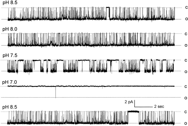 Figure 5. Concentration-dependent inhibition of single-channel activity by low pH. Single-channel currents were recorded from an inside-out patch using symmetric concentrations of K+ (150 mM) on both sides of the patch. At Vm of −80 mV, one active channel was seen at pHi 8.5, which had a Popen 0.934. No detectable change in channel activity was found at pH 8.0 (Popen 0.935). Channel activity decreased at pH 7.5 (Popen 0.548) and was almost completely inhibited at pHi 7.0 (Popen 0.001). Channel activity resumed to the baseline level (Popen = 0.899) after washout. C, closure; O, opening.