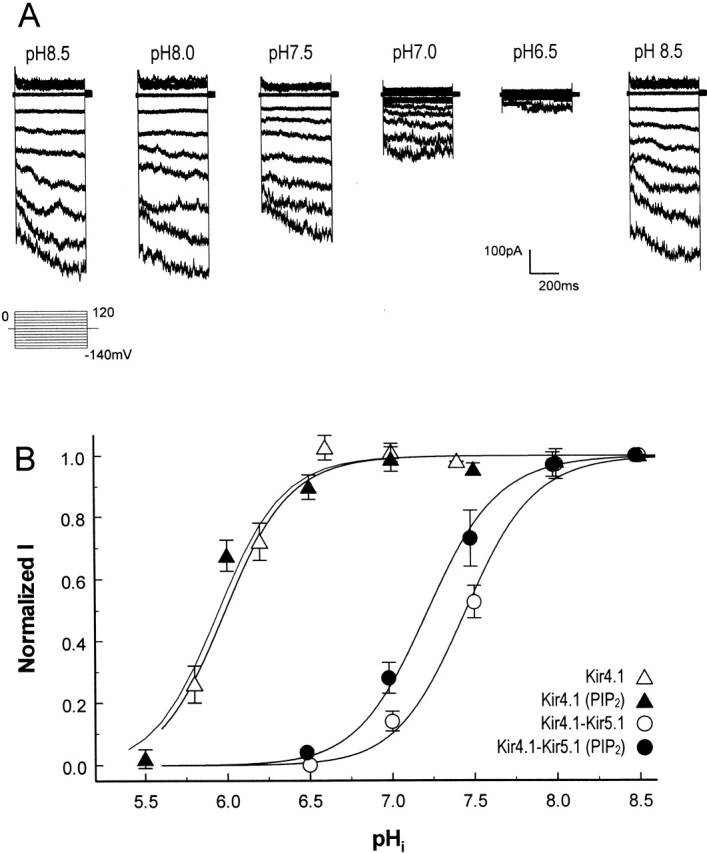 Figure 4. Effects of pHi on macroscopic Kir4.1–Kir5.1 currents. (A) Kir4.1–Kir5.1 currents were recorded from a giant patch with equal concentrations of K+ (150 mM) on either side of the membrane. Inward-rectifying currents were seen at pH 8.5 using command potentials from −140 to 120 mV in 20-mV increments. When pH in the internal solution was reduced to 7.5, these currents were inhibited by ∼60%. Further decreases in pHi caused strong inhibitions of these currents. Inward-rectifying currents were almost totally suppressed at pH 6.5. Washout led to a recovery of these currents to the baseline level. (B) The relationship of Kir4.1–Kir5.1 currents with pHi. These currents are inhibited at pH 7.5, augmented at pH 8.0, and completely shut off at pH 6.5. The relationship of currents (I) to pHi can be expressed using the Hill equation (solid line): I = 1/[1 + (pKa/pHi)h], where pKa is the midpoint pH value for channel inhibition and h is the Hill coefficient. The pKa and h here are pH 7.45 and 2.3, respectively. In comparison, the Kir4.1 was inhibited at much lower pH levels, with pKa 5.99 and h 2.0. The pH sensitivity of Kir4.1–Kir5.1 but not homomeric Kir4.1 was modulated by PIP2. In the presence of 10 μM PIP2, its titration curve was shifted leftward by 0.22 pH U.