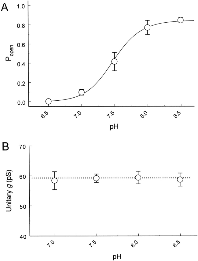 Figure 6. Effects of intracellular pH on Popen and single-channel conductance. (A) At pHi 7.5, the channel Popen is only about a half of its value at pHi 8.5 (average Popen 0.846). The Popen reaches almost its maximum level at pHi 8.0, and becomes nearly zero at pHi 6.5. The relationship of Popen versus pHi can be expressed with the Hill equation (solid line). The pKa (the midpoint of the channel inhibition) and h (the Hill coefficient) are pH 7.48 and 2.3 (n = 6), respectively. (B) In contrast to Popen, single-channel conductance retains at ∼59 pS and does not change with pH levels. Data are presented as means ± SEM.