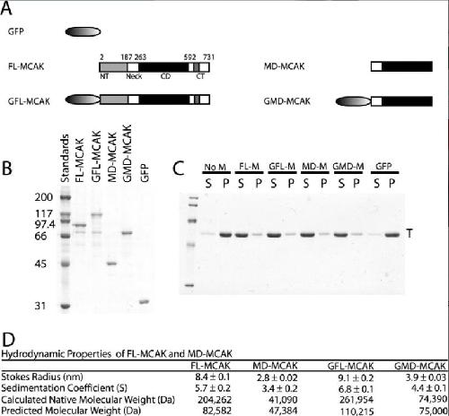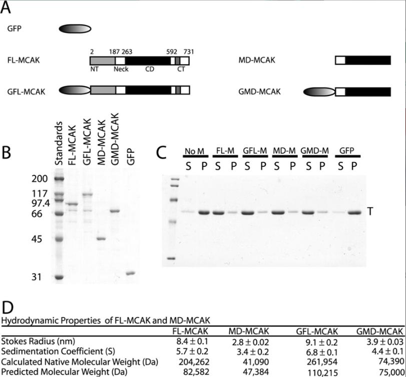 Figure 1. FL-MCAK is dimeric and MD-MCAK is monomeric. (A) Schematic representation of the proteins used in this study. NT, N terminus; Neck, class-specific neck region; CD, catalytic domain; CT, C terminus. The dark gray box within the C terminus represents the putative coiled coil region. The numbers correspond to amino acid residues. (B) Equal amounts (0.5 μg) of purified recombinant proteins were run on SDS-PAGE gels and stained with Colloidal Coomassie Blue. Molecular mass markers in kilodaltons are indicated on the left. (C) GMPCPP-stabilized MTs (1.5 μM) were incubated with control buffer (No M) or equal molar amounts (50 nM) of FL-MCAK (FL-M), GFL-MCAK (GFL-M), MD-MCAK (MD-M), GMD-MCAK (GMD-M), or GFP alone for 30 min at 22°C. MTs were separated from soluble tubulin heterodimer by ultracentrifugation. Supernatant (S) and pellet (P) were analyzed by SDS-PAGE followed by Coomassie staining. The position of tubulin (T) is indicated on the right. (D) Purified proteins were analyzed by sucrose gradient sedimentation and gel filtration chromatography to determine estimated molecular weights using Equation 1. All values represent an average ± SEM for at least three experiments. |