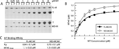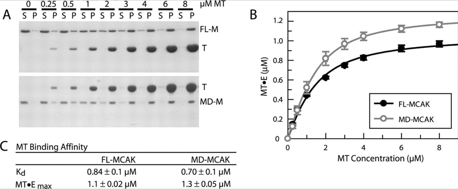 Figure 2. At high ratios of MCAK to MTs, FL-MCAK and MD-MCAK show similar affinities for MTs. (A) FL-MCAK or MD-MCAK (1.24 μM) was incubated in the absence of nucleotide with increasing concentrations of paclitaxel- and GMPCPP-stabilized MTs (0â8 μM) for 15 min at 22°C. FL-MCAK or MD-MCAK bound to MTs was separated from unbound enzyme by ultracentrifugation. Equal volumes of supernatant (S) and pellet (P) were run on SDS-PAGE gels and stained with Coomassie Brilliant Blue. (B) The amount of FL-MCAK or MD-MCAK in the supernatant and the pellet was quantified. The binding affinity curves were derived from Equation 3 and represent averaged data from at least three individual experiments. MT·E is the amount of FL- or MD-MCAK fractionating with MTs. (C) A summary of the binding affinities. |
