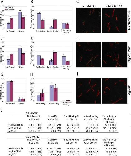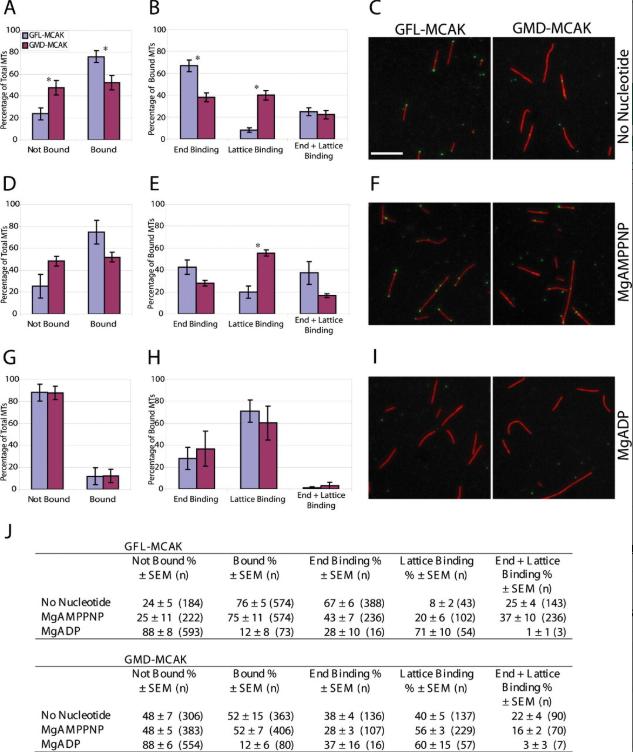Figure 3. At substoichiometric ratios of MCAK to MTs, GFL-MCAK binds more effectively to MT ends than GMD-MCAK. GFL-MCAK or GMD-MCAK (9 nM) was mixed with 400 nM GMPCPP-stabilized MTs for 15 min at room temperature without additional nucleotide (AâC), in the presence of 5 mM MgAMPPNP (DâF), or in the presence 5 mM MgADP (GâI). Reactions were fixed, sedimented onto coverslips, and processed for immunofluorescence. MTs were scored for the percentage of binding events (A, B, D, E, G, and H) without knowledge of the sample identity. Asterisk (*) denotes a statistically significant difference between GFL-MCAK and GMD-MCAK with a p value < 0.05. Representative micrographs of GFL-MCAK (green) or GMD-MCAK (green) binding to MTs (red) without additional nucleotide (C), or in the presence of MgAMPPNP (F) or MgADP (I). Bar, 5 μm. The localization of GFL-MCAK or GMD-MCAK in fluorescence microscopy binding assays was quantified (J). The reported value is the average percentage of MTs with GFL-MCAK or GMD-MCAK localization ± SEM. n is the total number of MTs counted from five independent experiments. |