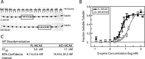 Figure 4. FL-MCAK depolymerizes MTs more efficiently than MD-MCAK. (A) GMPCPP-stabilized MTs (1 μM) were incubated with increasing concentrations (0â128 nM) of either FL-MCAK or MD-MCAK in the presence of saturating MgATP for 15 min at 22°C. Soluble tubulin heterodimer was separated from the remaining MTs by centrifugation. Equal volumes of supernatant (S) and pellet (P) were analyzed by SDS-PAGE followed by Coomassie staining, and the amount of depolymerization was then quantified using NIH Image. (B) The combined data derived from at least three separate experiments were fit to the dose-response curve (Equation 2). (C) Summary of the data derived from the graphs in B. |