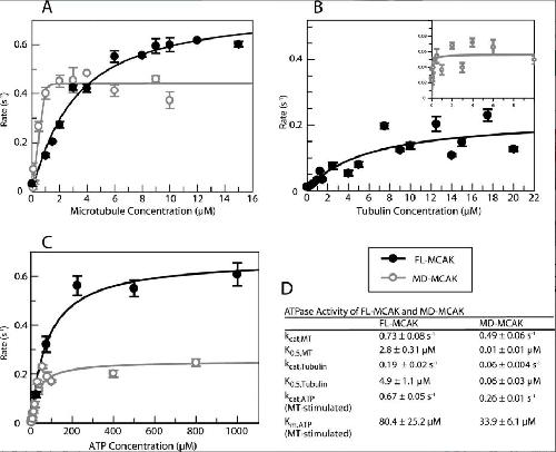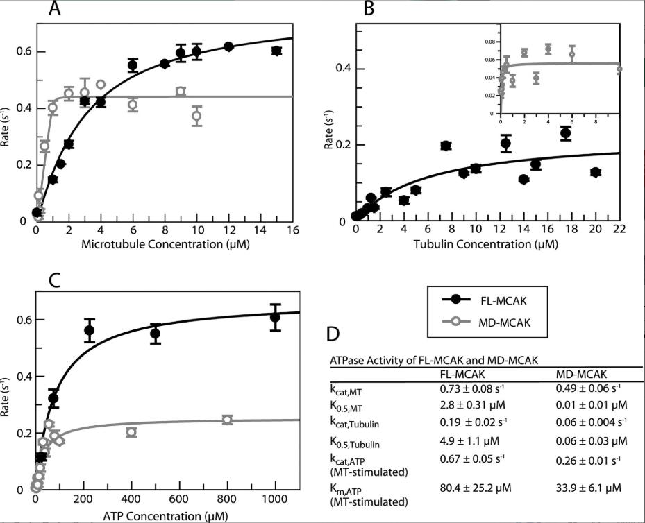 Figure 5. MD-MCAK has lower ATPase activity than FL-MCAK. FL-MCAK, and MD-MCAK (50 nM) were assayed for steady-state ATPase activity in the presence of increasing concentrations of (A) paclitaxel- and GMPCPP-stabilized MTs (0â15 μM) or (B) tubulin heterodimer (0â20 μM) at 2 mM MgATP. The data in A and B were fit to Equations 4 (for MTs) and 5 (for tubulin heterodimer). (C) The steady-state kinetics for FL-MCAK or MD-MCAK (50 nM) were determined as a function of MgATP concentration at 8 μM MTs for FL-MCAK and 4 μM MTs for MD-MCAK with the fit of the data to equation 5. (D) Summary of the kinetic parameters derived from A to C. |