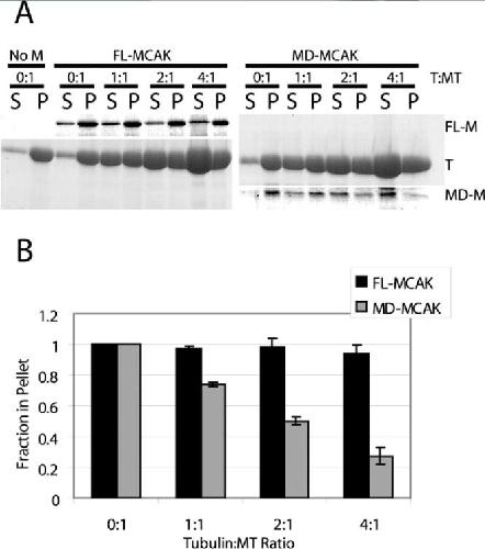 Figure 6. MD-MCAK binds with higher affinity to tubulin heterodimer than FL-MCAK. (A) FL-MCAK (FL-M) or MD-MCAK (MD-M) at 500 nM was incubated in the absence of nucleotide with paclitaxel- and GMPCPP-stabilized MTs (3.25 μM tubulin) as a function of soluble GDP tubulin heterodimer (0â13 μM) for 15 min at 22°C followed by centrifugation. Equal volumes of the supernatant (S) and pellet (P) for each reaction were analyzed by SDS-PAGE followed by Colloidal Coomassie staining. Because of the high ratios of total tubulin to MCAK enzyme in each reaction, the regions of each gel containing FL-MCAK or MD-MCAK were equally contrast-enhanced relative to the tubulin portion of the gel. T, tubulin. B, FL-MCAK and MD-MCAK partitioning to the supernatant and the pellet were quantified. The fraction of MCAK in the pellet in the absence of additional GDP tubulin heterodimer (0:1) was considered 100%. The partitioning of MCAK to the pellet as a function of GDP tubulin heterodimer was normalized to the 0:1 control. The data represent mean ± SEM for three individual experiments. |