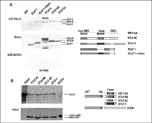 The conserved exon in LEF/TCF is the binding domain for HIC-5. A, recombinantly expressed GST-mHIC-5 was immobilized on glutathione-Sepharose and incubated with cell lysates from HEK293 cells transfected with the indicated Myc-tagged LEF/TCF constructs. Samples were analyzed by Western blotting with Myc epitope-specific monoclonal antibody 9E10 for the presence of the transfected constructs. GST-DCOH served as a negative control. BBD, β-catenin-binding domain; DBD, DNA-binding domain. B, recombinantly expressed exons of XTCF-3 and XTCF-4 were immobilized on glutathione-Sepharose and incubated with in vitro translated 35S-labeled mHIC-5. Upper panel, autoradiograph; lower panel, same gel stained with Coomassie Blue to demonstrate equal loading.