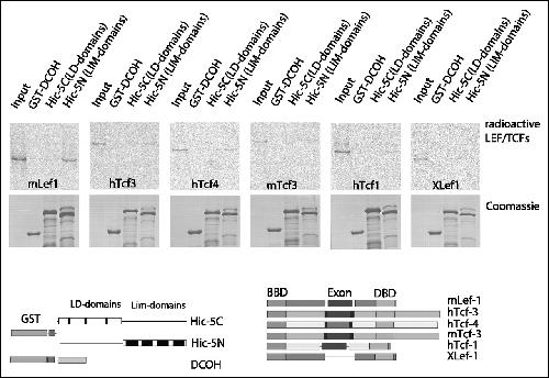 LEF/TCF proteins bind to the LIM domain-containing C-terminal half of HIC-5. The recombinantly expressed C-terminal half (GST-HIC-5ÎN, LIM domains, amino acids 212â430) and N-terminal half (GST-HIC-5ÎC, LD domains, amino acids 1â202) of mHIC-5 were immobilized on glutathione-Sepharose and incubated with in vitro translated 35S-labeled murine and human LEF/TCF proteins. Upper panels, auto-radiographs; lower panels, same gels stained with Coomassie Blue to demonstrate equal loading. GST-DCOH served as a negative control. BBD, β-catenin-binding domain; DBD, DNA-binding domain.