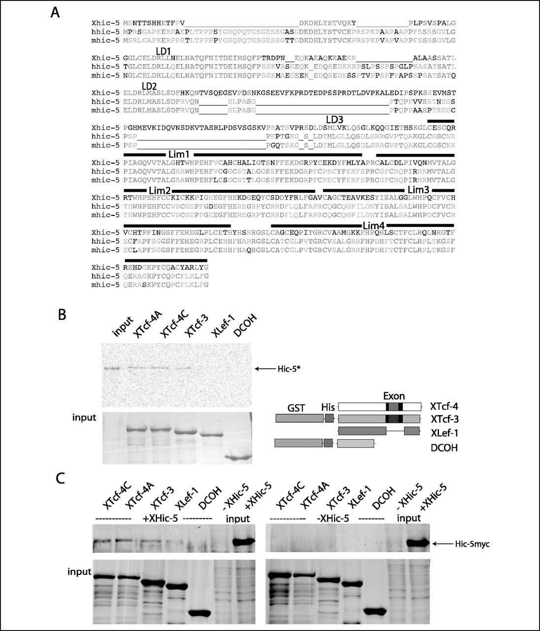 XHIC-5 binds to Xenopus TCF proteins. A, protein alignment of XHIC-5 with its human and murine orthologs reveals high homology in the LD and LIM domains. The three LD motifs are indicated, and the four LIM domains are illustrated by black bars. B, GST pull-down assay with in vitro translated XHIC-5 and immobilized Xenopus GST-LEF/TCF fusion proteins consisting of amino acids 63â274 for XLEF-1, amino acids 63â328 for XTCF-3, and amino acids 63â353 for XTCF-4 revealed that XHIC-5 specifically bound to XTCF-3 and XTCF-4, but only very weakly to XLEF-1. Recombinantly expressed GST-LEF/TCF fusion proteins were immobilized on glutathione-Sepharose and incubated with in vitro translated 35S-labeled XHIC-5. Upper panel, autoradiograph; lower panel, same gel stained with Coomassie Blue to demonstrate equal loading. The GST-DCOH fusion protein served as a negative control. C, GST pull-down assays with transfected Myc-tagged XHIC-5 confirmed the interaction with XTCF-3 and XTCF-4. Again, wild-type XLEF-1 hardly precipitated with immobilized GST-LEF/TCF fusion proteins. Recombinantly expressed GST-LEF/TCF fusion proteins were immobilized on glutathione-Sepharose and incubated with crude cell extracts of HEK293 cells transiently transfected with Myc-tagged XHIC-5. Upper panel, immunoblot stained with Myc epitope-specific monoclonal antibody 9E10; lower panel, same gel stained with Coomassie Blue to demonstrate equal loading. The GST-DCOH fusion protein served as a negative control.
