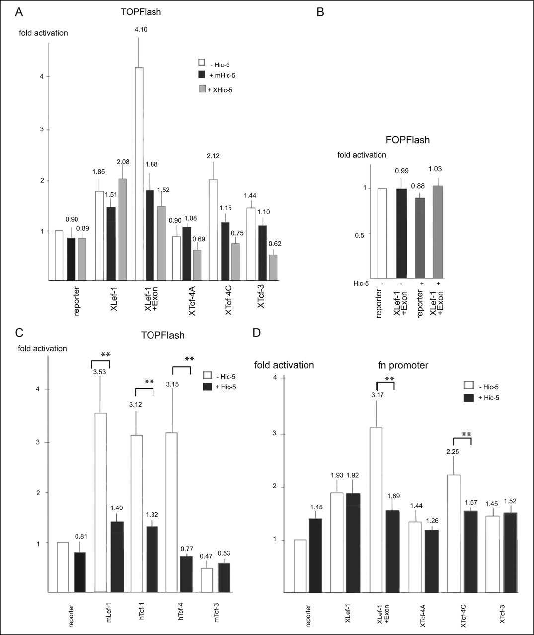 HIC-5 represses LEF/TCF-induced target gene promoter activation. A, HEK293 cells were cotransfected with TOPFlash, cytomegalovirus (CMV)-β-galactosidase for normalization, and the indicated LEF/TCF constructs in the absence (white bars) or presence of mHIC-5 (black bars) or XHIC-5 (gray bars). B, HIC-5 did not regulate the FOPFlash promoter in either the presence or absence of XLEF-1+Exon. HEK293 cells were cotransfected with FOPFlash, CMV-β-galactosidase for normalization, and XLEF-1+Exon in the presence or absence of mHIC-5. C, HEK293 cells were cotransfected with TOPFlash, CMV-β-galactosidase, and the indicated human and murine LEF/TCF proteins in the absence (white bars) or presence (black bars) of mHIC-5. D, HEK293 cells were cotransfected with the Xenopus fibronectin (fn) promoter, CMV-β-galactosidase, and the indicated LEF/TCF proteins in the absence (white bars) or presence (black bars) of mHIC-5. Each bar represents the average of 6–14 transfections. The error bars indicate the S.E. **, significant difference (p < 0.05, Student's t test).