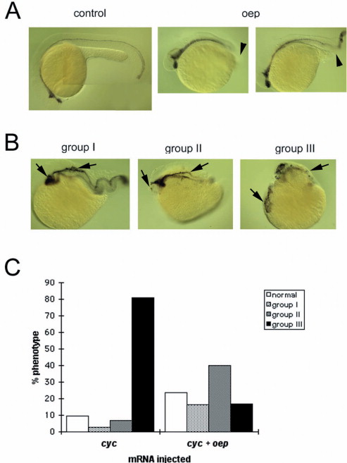 Fig. 3. Overexpression of oep causes posterior truncations (A) and inhibits hyperdorsalization by cyc in zebrafish embryos (B,C). (A) Uninjected control (left) and oep mRNA-injected embryos (right) stained with an antisense shh probe. Truncation of the posterior body axis is depicted by arrowheads. (B) Representative examples of phenotypic groups observed after injection of cyc mRNA alone or together with oep mRNA. Embryos were hybridized to shh mRNA at 24 h of development and are shown anterior to the left and dorsal side up except for group III embryos which are shown animal pole up. Ectopic shh expression is labelled with arrows. (C) Bar diagram depicting the frequency of group IâIII phenotypes caused by injection of cyc mRNA (n=323) or the combination of cyc and oep mRNA (n=238).