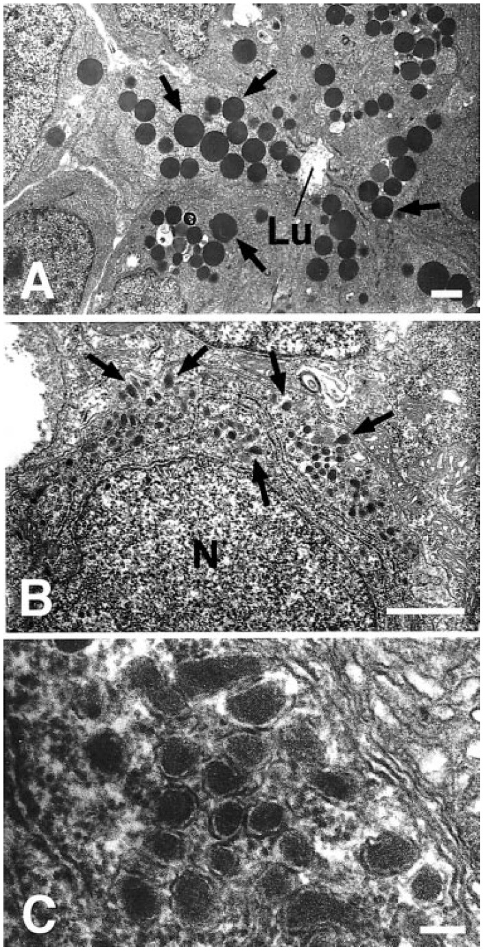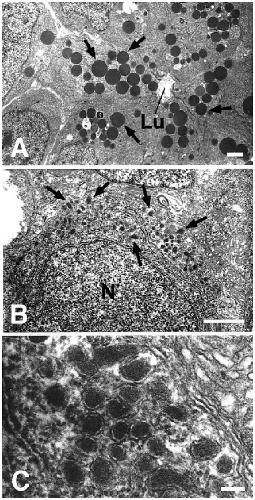 electron-dense granules (arrows). Lu, lumen of acinus-like structure.