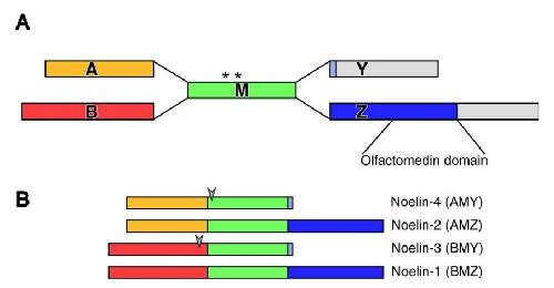 Fig. 1. Schematic diagram of Noelin isoform exon composition. (A) Noelins are made by differential promoter usage and alternative splicing. Exon structure was first elucidated in the rat by Danielson et al. (1994). The olfactomedin domain is indicated, as well as the location of the two cysteine residues conserved in all Noelins and homologous to cysteines in Olfactomedin that are responsible for disulfide bonding in multimerization (asterisks in M region). (B) Noelin exon terminology used in this work is shown, with predicted signal peptide cleavage sites indicated with arrowheads. |