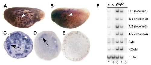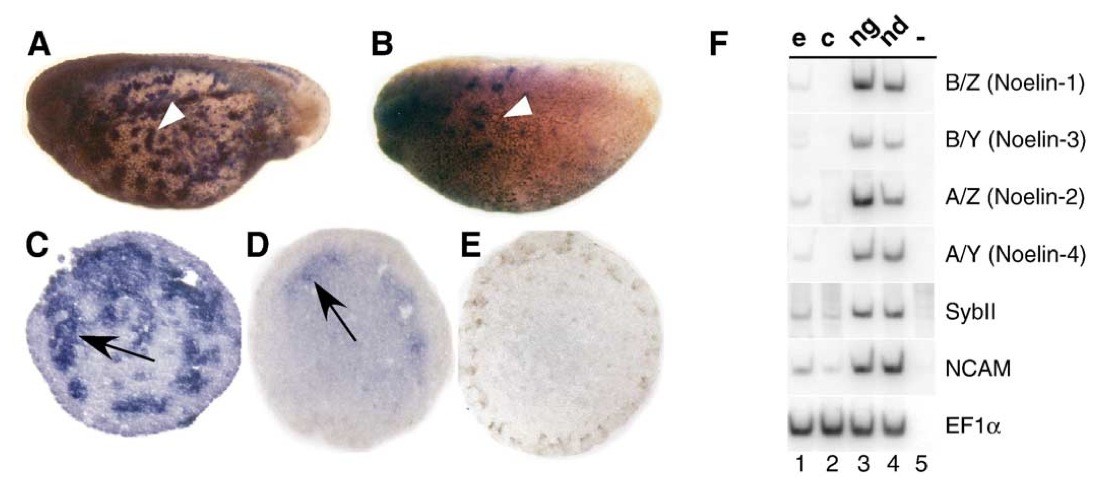 Fig. 4. Noelin-3 and -4 are induced by neurogenin. (A, B) Embryos were injected in one cell at the two-cell stage with 100 pg of X-ngnr-1 and cultured to stage 24. Whole mount in situ hybridization for N-tubulin (A) or the Y exon of Noelin-3 and -4 (B) is shown. Ectopic neurons staining with the markers are indicated with arrowheads. (C-E) cross-sections of animal caps from embryos injected with 100 pg X-ngnr-1 or lacZ in 2/2 cells, excised at stage 9 and cultured to stage 22. Arrows point to regions staining with the markers. (C) N-tubulin staining; (D) Y exon staining; (E) lacZ-injected, N-tubulin staining. Embryos for this experiment were derived from pigmented mothers; brown color is due to pigment granules. (F) RT-PCR on stage 22 animal caps explanted at stage 10, derived from embryos injected with lacZ (c, lane 2), X-ngnr-1 (ng, lane 3), or XNeuroD (nd, lane 4), or on whole embryo controls (e, lane 1). Both XNeuroD and X-ngnr-1 induced expression of all four Noelin isoforms. RNA without reverse transcriptase was used as a negative control (-, lane 5). Primers used are indicated; each Noelin set hybridizes to only the indicated isoform. SybII = synaptobrevinII, a marker for differentiating neurons (Knecht et al., 1995). |