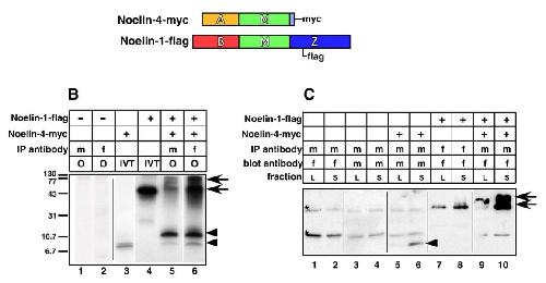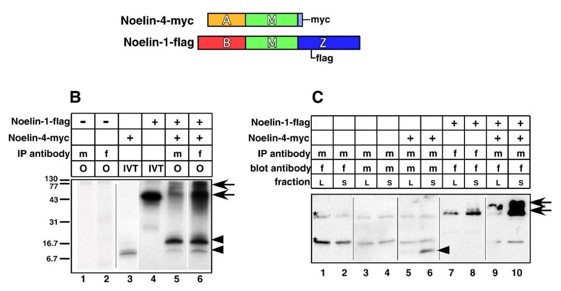 Fig. 7. Noelin-4 binds to Noelin-1. (A) Noelin-4-myc and Noelin-1-flag constructs used are shown diagrammatically. Noelin-1 bears an internal Flag epitope when designated with a plus sign (+), or is without a tag when designated with a minus sign (ï°). O, oocyte; IVT, in vitro-translated protein; m, myc; f, flag. (B) Co- immunoprecipitation assay in Xenopus oocytes. Oocytes were injected as indicated and cultured in the presence of 35S-methionine. Oocyte controls were injected with an untagged version of Noelin-1 and immunoprecipitated with either myc or flag (lanes 1, 2). In vitro-translated proteins (lanes 3, 4) are compared to oocyte- translated proteins (lanes 5, 6). Samples were immunoprecipitated with the indicated antibody (m = myc; f = flag). Noelin-4-myc is indicated with arrowheads; Noelin-1-flag is indicated with arrows. (C) IP-Western blot. COS-7 cells were transfected with the indicated plasmids and then immunoprecipitated with either myc or flag antibodies. Lysate (L) and supernatant (S) fractions were then resolved on SDS-PAGE and transferred to nitrocellulose before enhanced chemiluminescence detection with the indicated antibody. Some of the precipitating antibodies were also eluted during sample preparation; heavy and light-chain immunoglobulin bands detected with the Western secondary antibody are indicated with asterisks in control lane 1. Noelin-4-myc is denoted with an arrowhead; Noelin-1-flag is denoted with arrows. Myc pull-down of Noelin-4-myc samples brought down a band that immunoreacted with myc on the Western blot (arrowhead, lanes 5, 6), as did flag pull-down on samples transfected with Noelin-1-flag and subsequently blotted for flag (lanes 7, 8). Samples transfected with both plasmids and immunoprecipitated with anti-myc contained flag-immunoreactive bands at the size of Noelin-1-flag (arrows, lanes 9, 10). |