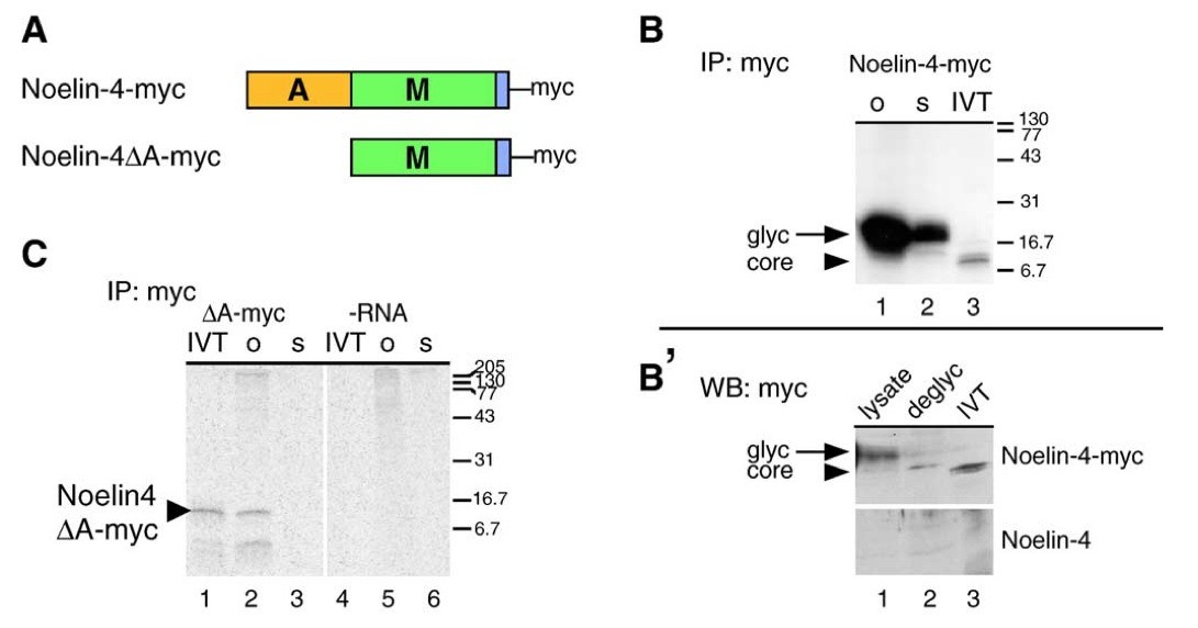 Fig. 2. Noelin-4 is a secreted, glycosylated protein. (A) Noelin constructs used in these studies are shown schematically. Noelin-4 was myc-tagged at the carboxy terminal. Noelin-4DA-myc is Noelin-4-myc with the A exon removed. (B) Noelin-4-myc was immunoprecipitated from oocyte (o, lane 1) and supernatant (s, lane 2) fractions. In vitro-translated protein (IVT) is shown in lane 3. Oocyte and supernatant fractions contain Noelin-4 protein that is larger than the size of in vitro- translated core protein. (BV) Anti-myc Western blot of embryos injected with Noelin-4-myc or Noelin-4 (for a Western blot control) as indicated. Proteins were run on SDS-PAGE either as embryo lysate (lane 1), lysate treated with PNGase F (deglyc, lane 2) or in vitro-translated protein (IVT, lane 3). Proteins in the deglycosylated sample collapsed to the size of in vitro-translated protein. (C) Noelin-4DA-myc immunoprecipitated from the oocyte fraction only, and was not found in the supernatant fraction (lane 2 versus lane 3). Control oocytes and supernatant are shown in lanes 4-6. |