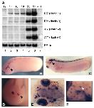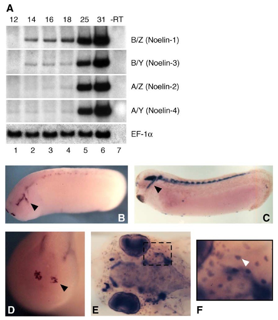 Fig. 3. Developmental expression patterns of Noelins. (A) Noelin temporal expression patterns. Embryos were harvested at the stages indicated and examined for the presence of the specific Noelin isoforms by RT-PCR. EF1a is a loading control, -RT is a control for genomic DNA contamination. Primer pairs used hybridize to only one splice variant each, as indicated. Noelin expression is observed weakly from neural plate stages, with strong expression from late neurula stages. (B-F) Spatial expression pattern of Noelin-3/4 (Y exon in situ hybridization, purple staining). Anterior is to the left. (B) Side view of stage 27 embryo with staining in cranial ganglia (arrowhead) and spinal cord; (C) stage 29 embryo with staining in trigeminal ganglion (arrowhead) and spinal cord; (D) anterior view of stage 26 embryo highlighting olfactory placode expression (arrowhead); (E) dorsal view of stage 42 embryo with staining in cranial ganglia, eye, and neuromasts; (F) magnification of boxed region in panel D showing neuromast expression (arrowhead). |
