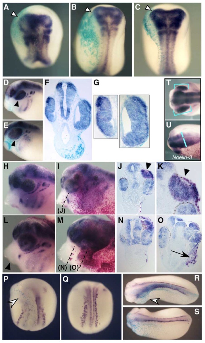 Fig. 5. Noelin-4 over-expression results in expansion of neural fate. Embryos injected with Noelin-4 exhibit enlarged and ectopic neural tissue. Embryos were injected with 500 pg (A - G, P - S) or 1 ng (H - O) of Noelin-4 mRNA, 500 pg Noelin-3 (T, U), and 100 pg of lac Z mRNA as a lineage tracer. h-galactosidase activity was assessed with X-gal (turquoise, A-G) or Magenta-Gal (magenta, H-O) and embryos were stained for Sox-2 expression. (A-C) Neural plate stage embryos injected with (A) Noelin-4 (AMY), (B) Noelin-2 (AMZ) or (C) lacZ. Injected side is to the left, embryos are photographed from the dorsal side, oriented with anterior pointing up. Anterior neural plate is indicated with an arrowhead. Note expansion of the neural plate in panel A. (D - G) Embryos were harvested at stage 29 and stained for Sox-2 expression. (D) Control side, (E) injected side of same embryo. Neural retina is revealed by Sox-2 staining, note that injected side eye is larger than control side (arrowheads). (F) Cross section through midbrain region; (G) comparison of neural retinas from both sides of the embryo magnified to the same degree. (H - O) Examples of embryos harvested at stage 35 and stained for Sox-2 expression. (H, L) Control side; (I, M) injected side. Panels J, N, and O are cross- sections through the head regions with the section level indicated on panels I and M. Panel K is a magnification of the injected side in panel J. Note expansion of neural tissue and ectopic Sox-2 staining (arrowhead). Panel O shows an ectopic cement gland ventral to the eye (arrow) that is discontinuous with the endogenous cement gland (see arrowhead in panel M). (P-S) N-tubulin staining of embryos injected with Noelin-4 (P, R) or Noelin-1 (Q, S). (P, Q) Neural plate stage embryos, with injected side to the left, anterior pointing to top. (R, S) Embryos at stage 24 with anterior to the left. Arrowheads indicate bulging tissue on the injected side in panels P, R. (T, U) Noelin-3 causes similar neural territory expansion. Noelin-3 (BMY) injection, Sox-2 staining. Bars and brackets outline width of neural structures in two different embryos on the injected side (bottom half) and uninjected control side (top half). |