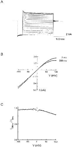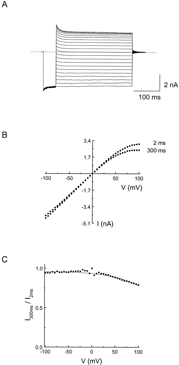 Figure 1. Current–voltage relationship of the IRK1 channel. (A) A family of current traces recorded from an inside-out patch at membrane voltages from −100 to +100 mV in 5-mV increments. However, for clarity, we plotted only the current traces recorded at 10-mV intervals. The recording was made without adding any tested blocking ions in the intracellular solution. (B) The I-V curves of the channel obtained 2 and 300 ms after the start of the voltage step. (C) The ratio of the currents in B is plotted against membrane voltage. The curve superimposed on the data is the fit of equation I300 ms/I2 ms = 1/(1 + K*eZ*FVm/RT), which corresponds to a model where increasing membrane voltage increases the probability of a channel (Ch) entering a nonconducting state (Ch*). The equilibrium constant K* is defined as the ratio of the fractions of Ch* and Ch, while Z* is the apparent valence for the transition Ch ↔ Ch*. From the fit, we obtain K* = 0.03 ± 0.01 and Z* = 0.55 ± 0.01 (mean ± SEM, n = 6). |